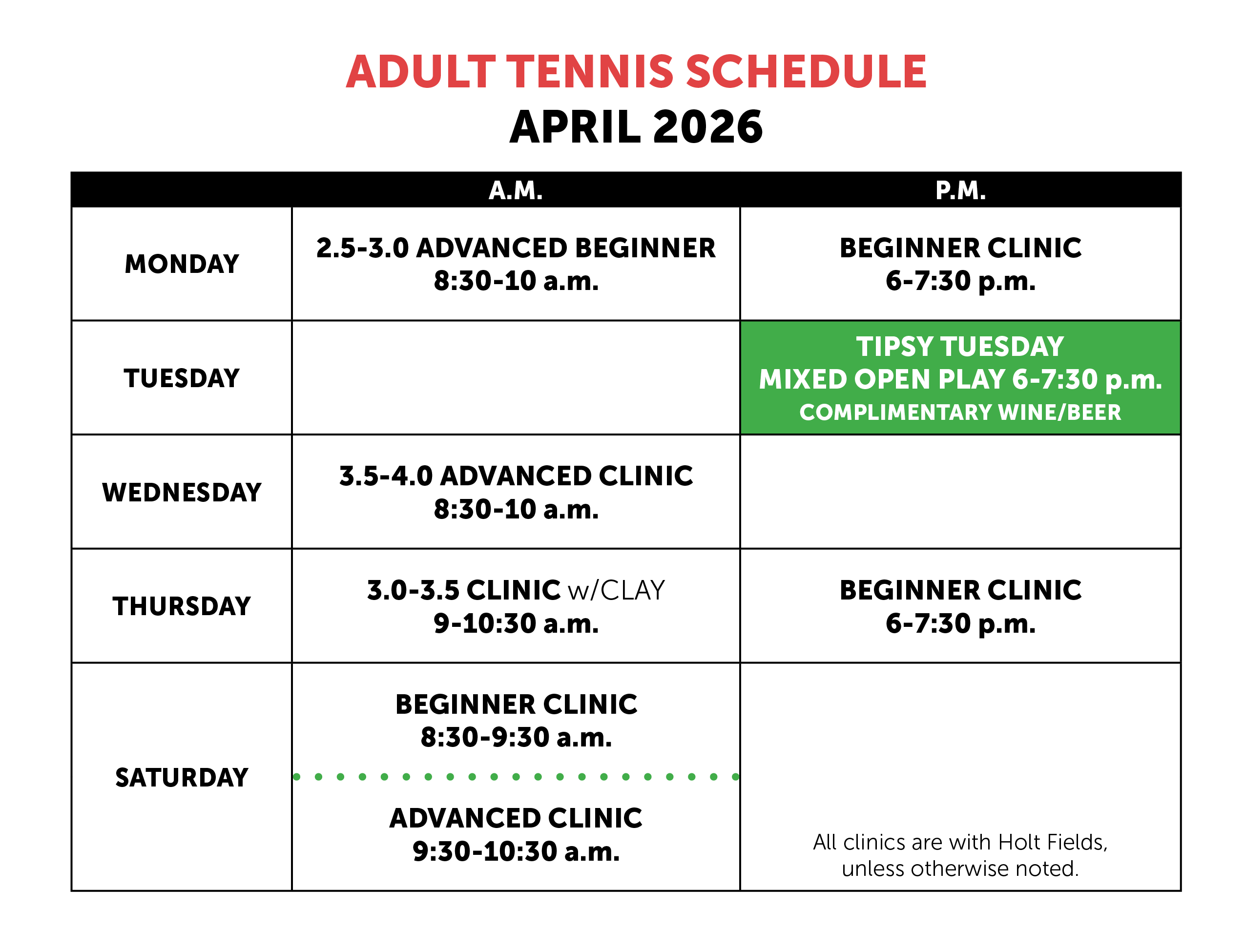 - Clay’s Thursday morning clinic remains at 9 a.m.